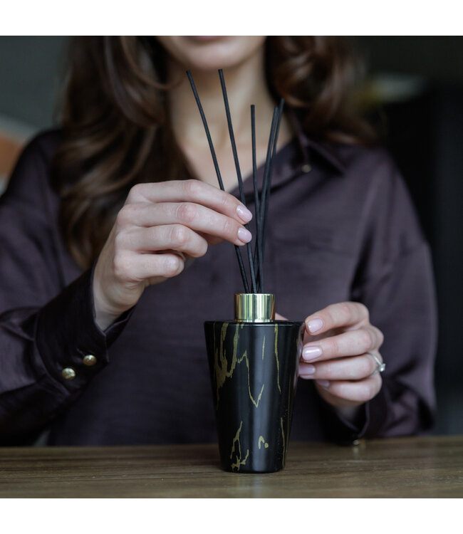 Pure indulgence, perfect for giving as a gift or receiving as one! This black reed diffuser is filled with the delightful Rose & Almonds scent. It comes standard with 7 black fragrance sticks so you can enjoy this scent at home.